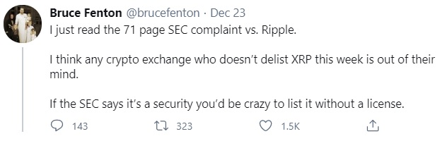 در حقیقت ادعای کمیسیون بورس و اوراق بهادار برای ارزیابی رمزارز ریپل به عنوان اوراق بهادار نگرانی صرافیها را به همراه داشته است. بروس فنتون(Bruce Fenton)؛ بنیانگذار شرکت آتلانتیک فایننشال در این رابطه اظهار داشت: