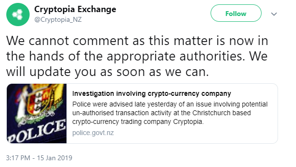 پیش از این توئیت، Cryptopia با انتشار اطلاعیهای اعلام کرد که بنابر درخواست پلیس، قادر به بروزرسانی اطلاعات نیست و از کاربران درخواست کرد که شبکههای اجتماعی این صرافی را دنبال کنند.