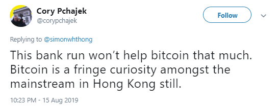 رهبر برجستهی معترضان هنگکنگ خواستار مهاجرت از بانکها شد و از مردم خواست تا حسابهای بانکی خود را تخلیه کنند. درخواست خروج از سیستم بانکی هنگکنگ موجب واکنش طرفداران بیتکوین در توییتر گردید.