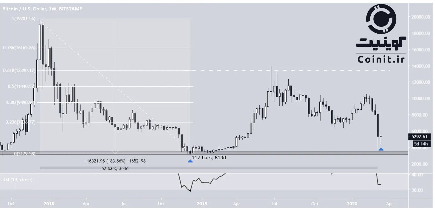 پس از این، روند تغییرات ارزش تقویت شد و قیمت بیت کوین توانستند به سطح بازگشت ۰/۶۱۸ فیبوناچی روند نزولی پیشین خود باز گردد. سطح کمینهی بعدی نیز دقیقاً همان سقوط ارزش روزهای گذشته میباشد، که باعث شد قیمت هر واحد بیت کوین در ماه مارس ۲۰۲۰ نزدیک به ۴ هزار دلار ثبت شود.