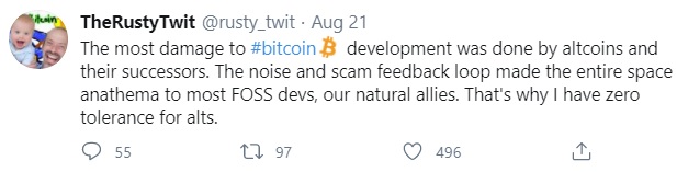 یکی از توسعهدهندگان نرمافزارهای منبع باز رایگان(FOSS) با نام کاربری دراستیتویت(TheRustryTwit) معتقد است که آلت کوینها بر فرآیند توسعهی بیت کوین آسیب میرسانند. وی در یک پست توییتری اظهار داشت:
