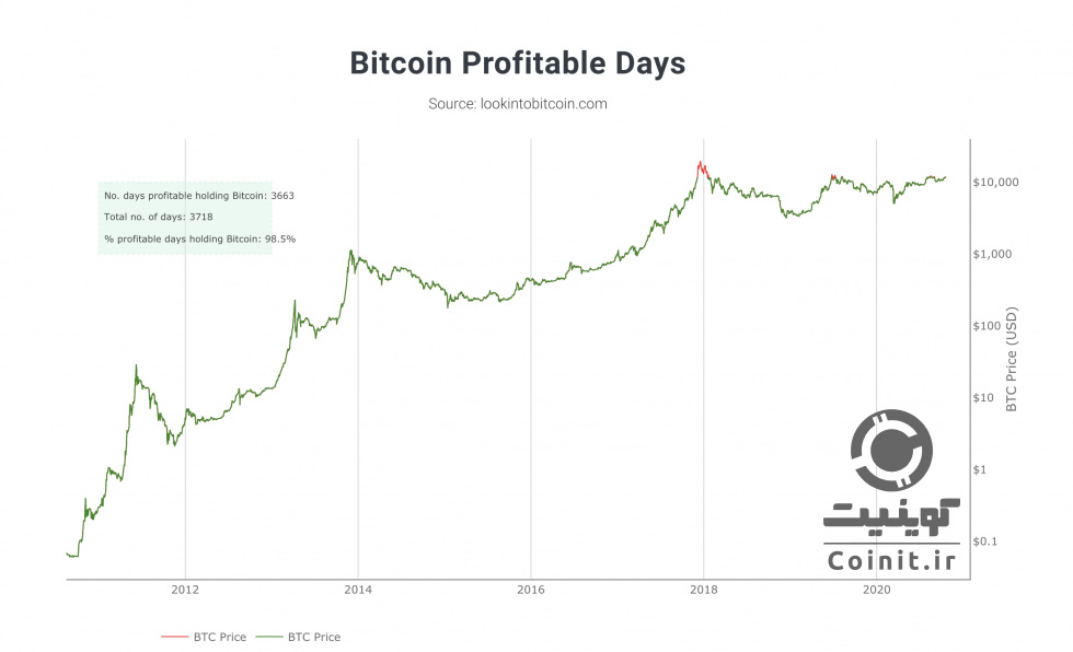 - در حال حاضر رمزارز بیت کوین به عنوان برترین دارایی سرمایهگذاری در بازارهای مالی توصیف میشود، زیرا توانسته بیش از هر دارایی سرمایهگذاری دیگری(حتی طلا و سهام) سودآوری برای سرمایهگذاران خود به همراه داشته باشد. این درحالیست که طبق دادههای منتشر شده توسط محققان وبسایت لوکاینتو بیت کوین(LookIntoBitcoin) تقریباً ۹۸/۵ درصد چرخهی زندگی بیت کوین با سودآوری همراه بوده و تنها سرمایهگذارانی که از روی ترس(FOMO) اقدام به خرید کردهاند با ضرر مالی مواجه شدهاند. طبق آمار منتشر شده در رابطه با این موضوع، از ۳۷۱۸ روز فعالیت رمزارز بیتکوین، ۳۶۶۳ روز آن با افزایش ارزش دارایی همراه بوده است، به عبارتی شما در صورت خرید بیت کوین در این روزها بدون شک با افزایش سرمایه مواجه شدهاید.