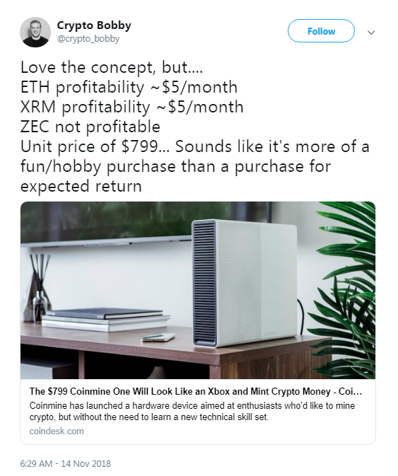 با این حال، بالاجی سرینیواسان(Balaji Srinivasan) مدیر ارشد بخش تکنولوژی Coinbase نسبت به یک استارتآپ جدید به نام Coinmine بسیار امیدوار است و فکر میکند که این استارتآپ ممکن است تغییر دهندهی وضعیت کنونی باشد. استارتآپ مذکور اولین ماینر خانگی خود را در روز چهارشنبه برای پیشفروش معرفی کرد.