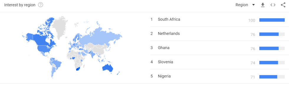 در حال حاظر، کلمهی «بیتکوین(Bitcoin)» به علت بیثباتی اقتصادی و سیاسی در آفریقای جنوبی بسیار محبوب است. براساس اطلاعات Google trends، علاقه به بیتکوین در این مکان از هر نقطهی دیگر در جهان بیشتر است.