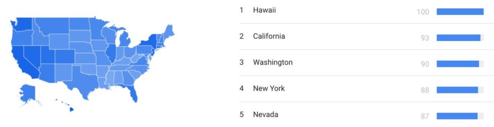 در ایالات متحدهی آمریکا، ایالت هاوایی(Hawaii) از نظر علاقه به بیتکوین در صدر لیست قرار میگیرد و پس از آن کالیفرنیا(California)، واشنگتن(Washington State) و نیویورک قرار میگیرند. تمامی این مکان ها به دلیل کشمکش در فعالیتهای رمزارزی شناخته میشوند.