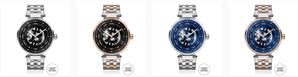 این ساعتهای زیبا در چهار طرح مختلف عرضه خواهند شد که دو مدل دارایی پس زمینهی سیاه رنگ و دو مدل دیگر زمینهای آبی رنگ دارند که با بندهایی از جنس فولاد ضد زنگ 316L به رنگ نقرهای یا طلایی عرضه خواهند شد.