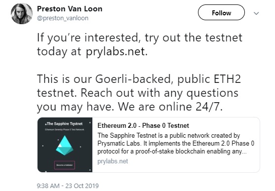 پرستون ون لون(Preston Van Loon)، یکی از اعضای آزمایشگاه Prysmatic نسبت به راهاندازی شبکهی آزمایشی اتریوم اظهار آمادگی کرد. وی افزود: