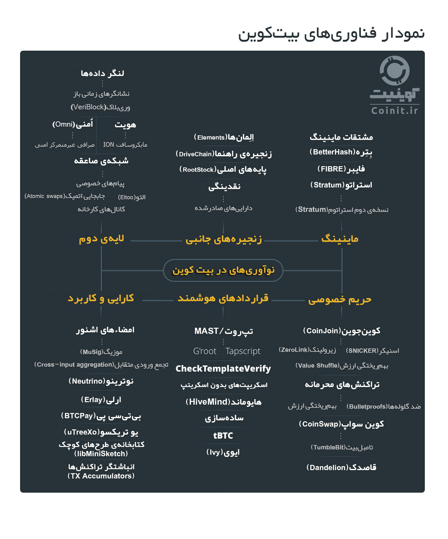 نمودار فوق نشان دهندهی اغلب نوآوریهای نسبتا جدید مرتبط با بیت کوین بوده و دید بهتری نسبت به فناوریهای مرتبط با این پروژهی رمزارزی ارائه میکند. البته این نمودار جامع و کامل نیست و هیچ مهر تاییدی بر روی ابتکارات و پروژههای نامبرده نمیباشد.